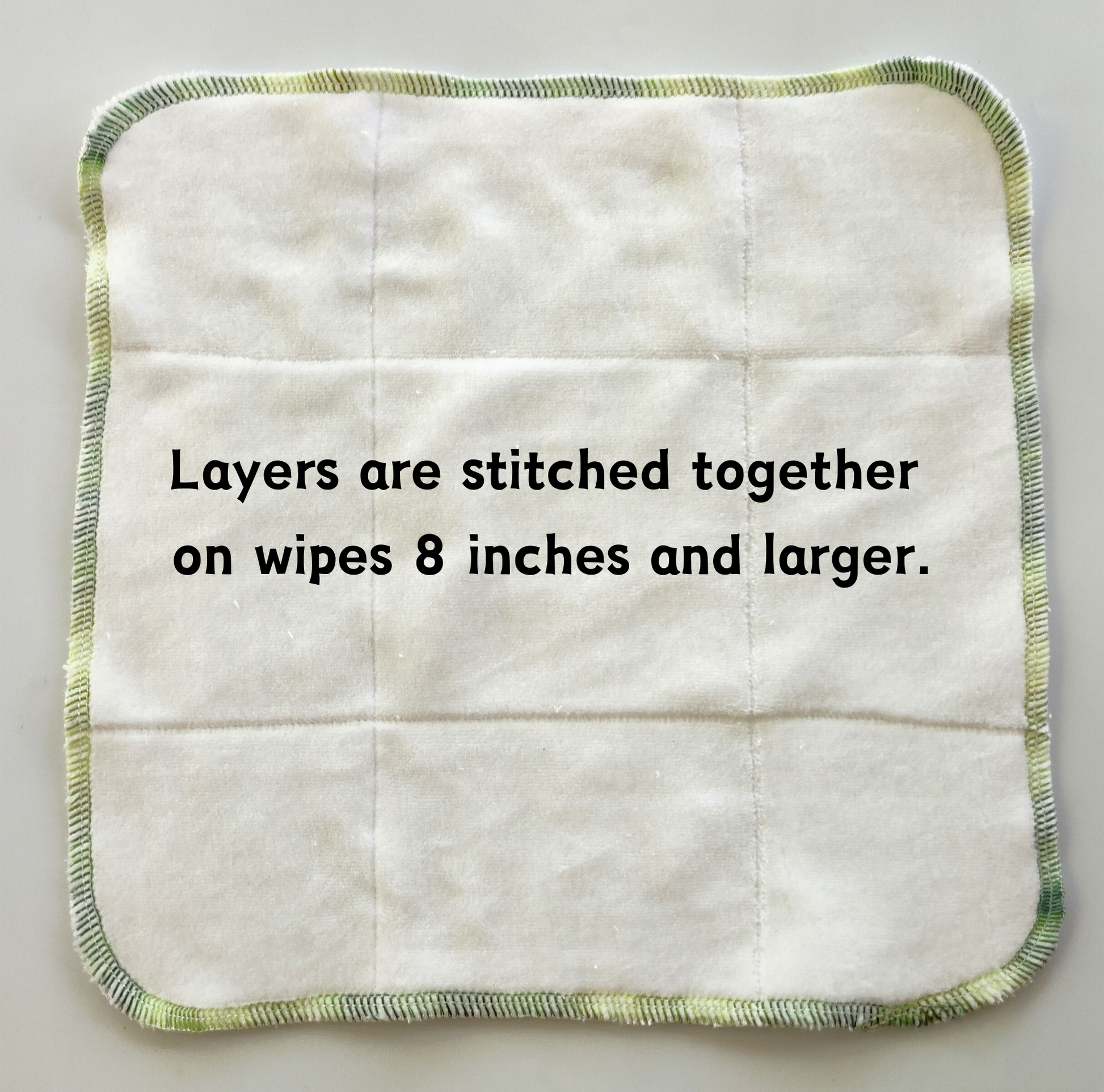 Made from two layers of fabric: a layer of super-soft absorbent organic velour (90% organic cotton and 10% polyester for stability in backing) and a scrubbier layer of bamboo/organic cotton baby terry (70% bamboo, 28% organic cotton, 2% poly). You choose the size and edge color. Our original favorite size is 7x7 inches. Wipes that are 8x8 and larger have the layers quilted together.